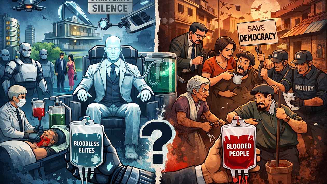 त्या देशात शरीर बदलण्याची एक अधिकृत प्रक्रिया आहे. ती अतिशय खर्चिक आहे. आधी शरीरातून रक्त काढलं जातं. आणि त्या रक्तासोबत नुसतं हिमोग्लोबिन नाही—तर नीतिमत्ता, प्रामाणिकपणा, संवेदनशीलता, सहानुभूती, प्रश्न विचारण्याची सवय… सगळं काढून टाकलं जातं.