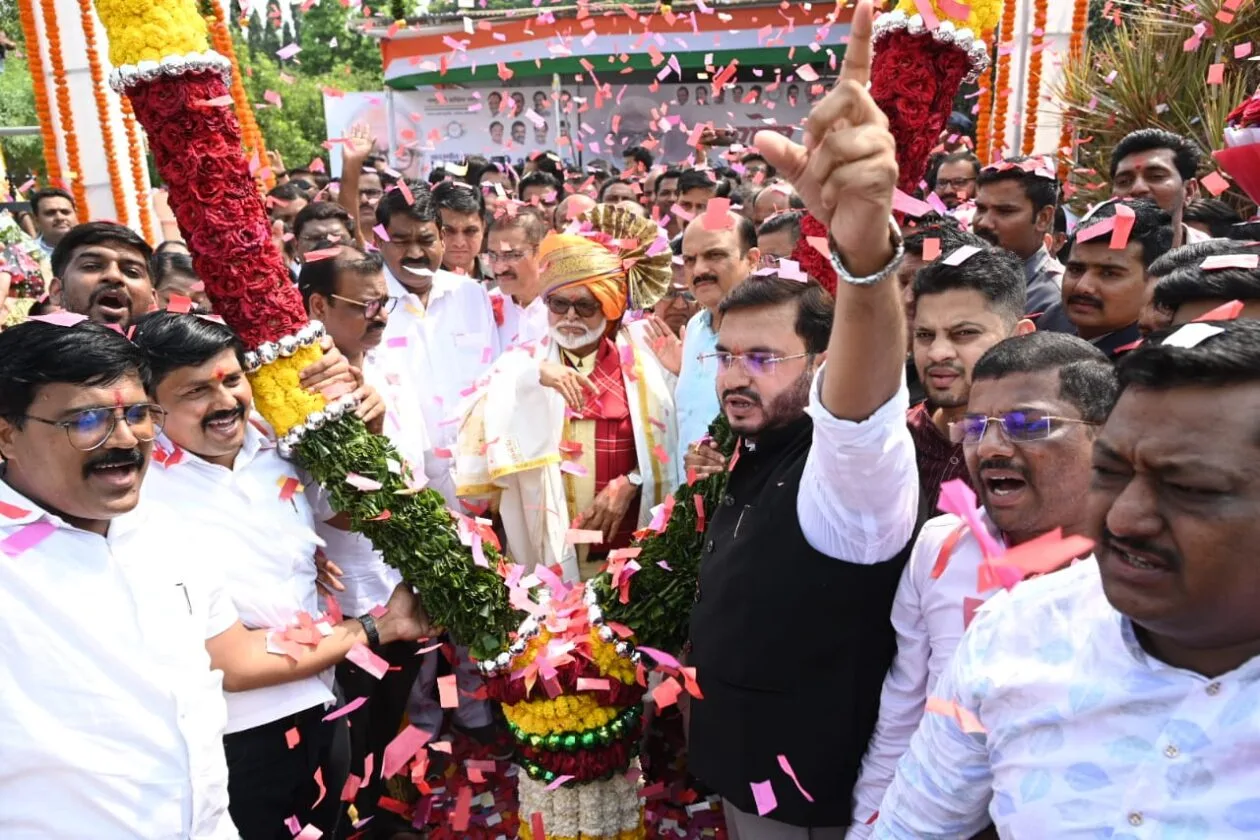 राज्याचे अन्न,नागरी पुरवठा व ग्राहक संरक्षण मंत्री तथा राष्ट्रवादी काँग्रेस पार्टीचे जेष्ठ नेते छगनरावजी भुजबळ यांच्या अभीष्टचिंतन सोहळ्या निमित्त मुंबई प्रदेशाध्यक्ष समीर भुजबळ, पंकज भुजबळ व राष्ट्रवादी युवक काँग्रेसचे शहराध्यक्ष अंबादास खैरे यांनी क्रेनच्या सहाय्याने २५ फूट पुष्पहार व शाल,फेटा घालत ढोल ताशांच्या गजराने जंगी स्वागत करून शुभेच्छा दिल्या. यावेळी युवक राष्ट्रवादीच्या पदाधिकाऱ्यांनी जमा केलेल्या १००० वह्यांचे वाटप मंत्री छगनरावजी भुजबळ यांच्या हस्ते गरजू शालेय विद्यार्थ्यांना करण्यात आले.