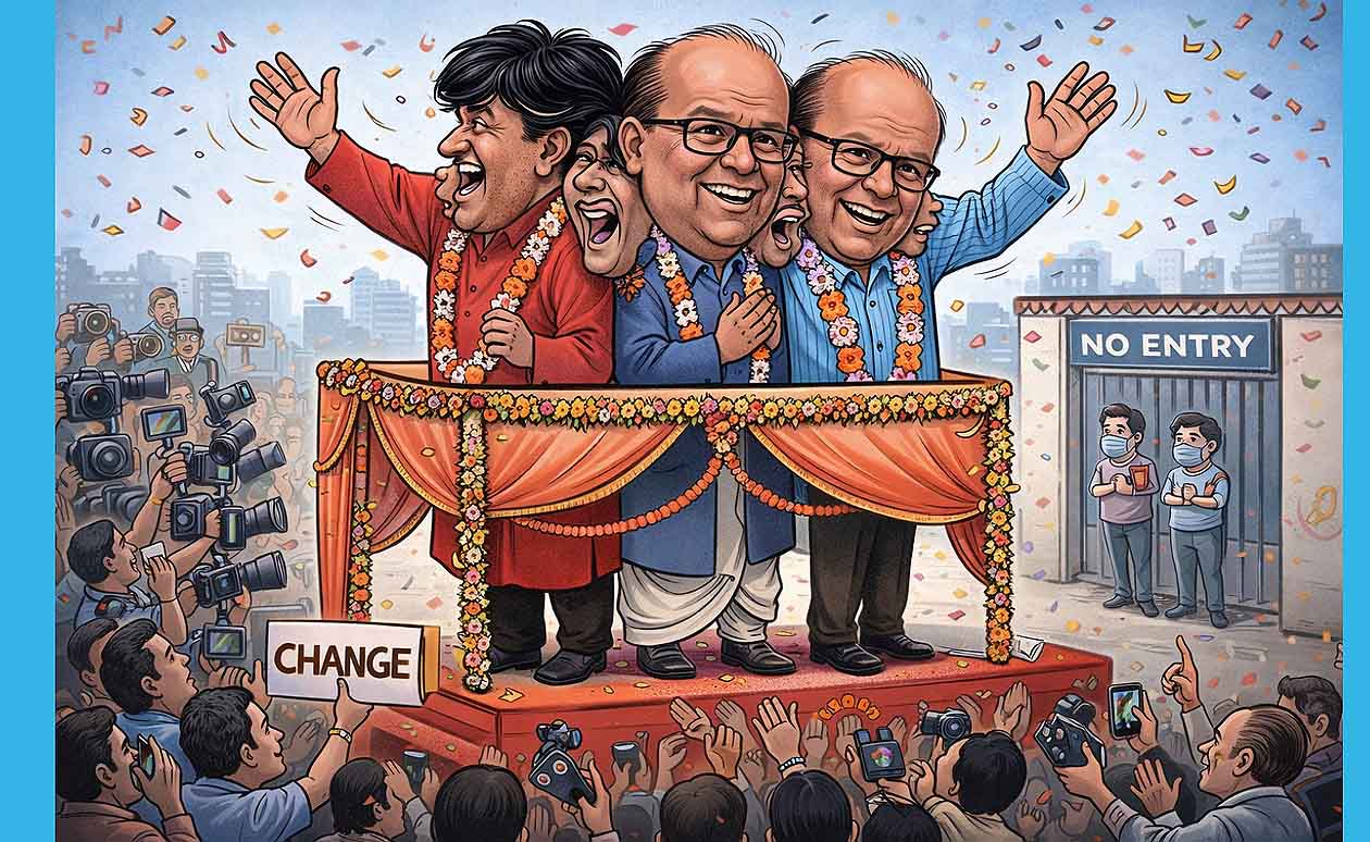 शेवटी काय झालं, हे सगळ्यांनाच माहीत होतं. दोन तोंडाचा म्होरक्या आणि तीन तोंडाचा प्रधान—एकमेकांच्या आधाराने—पुन्हा बोहल्यावर चढले. जुने हार, जुनी फुले, जुन्याच घोषणा.