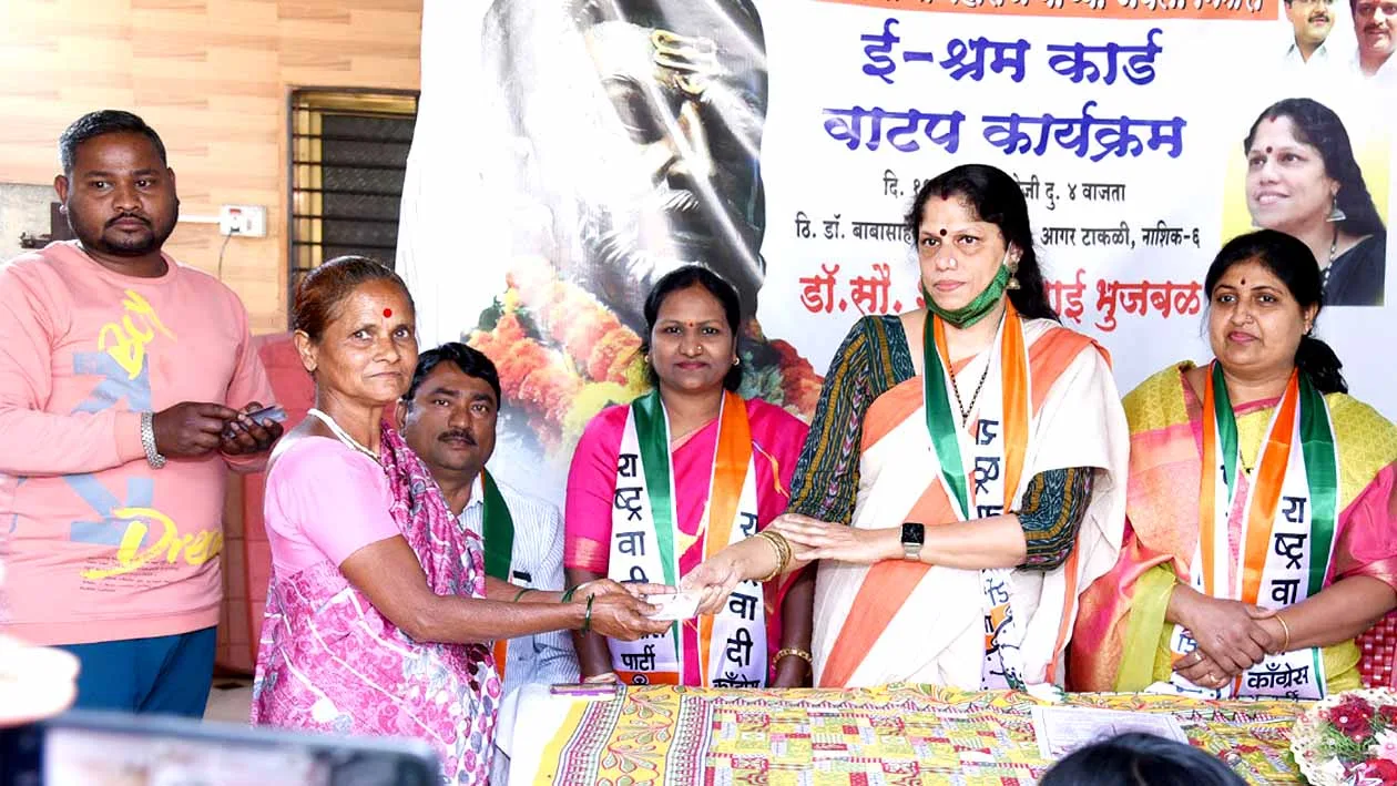नाशिकरोड (प्रतिनिधी) – आगरटाकळी येथे शिवजयंती निमित्त राष्ट्रवादी काँग्रेस पक्षातर्फे राष्ट्रवादी काँग्रेस मध्य विभाग महिला आघाडीच्या अध्यक्षा श्रीमती.रंजना गांगुर्डे यांच्या पुढाकाराने श्रमिक श्रेणीतील,असंघटित क्षेत्रातील कामगारांना ई श्रम कार्डचे वाटप करण्यात आले. ई-श्रम कार्डचे मोफत वाटप करण्यात आले. ई-श्रम कार्डचे मोफत वाटप झाल्याने महिला कामगारांनी राष्ट्रवादी काँग्रेस पक्षाचे आभार मानले.