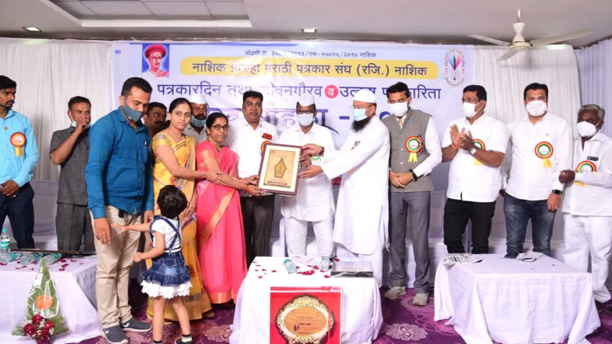 नाशिक जिल्हा मराठी पत्रकार संघ [रजि.]नाशिकचा पत्रकार दिनी जीवनगौरव व जिल्हास्तरीय उत्कृष्ट पत्रकार पुरस्कार गौरव सोहळा गुरुवारी (दि.६) महाराष्ट्र विधानसभा उपाध्यक्ष ना. झिरवाळ यांच्या अध्यक्षतेखाली मालेगाव येथील ऐश्वर्या काॅन्फरन्स हाॅल येथे उत्साहात पार पडला. यावेळी व्यापीठावर आ.मौलाना मुफ्ती मोहंमद ईस्माईल, उपमहापौर निलेश आहेर ,मामको बॅंकेचे चेअरमन,युवा नेते राजेंद्र भोसले,जिल्हा पत्रकार संघाचे संस्थापक-जिल्हाध्यक्ष यशवंत पवार, राष्ट्रवादीचे नेते विनोद चव्हाण,नगरसेवक भिमा भडांगे भाजपचे देवा पाटील, कृउबा सचिव अशोक देसले व प्रकाश अहिरे आदींसह सर्व पक्षीय पदाधिकारी उपस्थित होते.