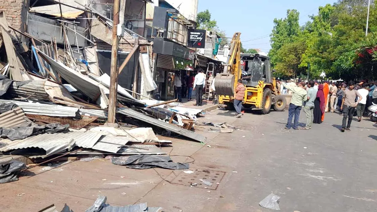 नाशिक,दि. ४ मे २०२३ – नाशिकच्या मध्यवस्तीत शालिमार चौकाजवळी नागरिकांना नियमित वाहतुकीच्या समस्यांचा सामना करावा लागत होता. कालिदास कला मंदिराजवळून शालिमार कडे येण्यासाठी वाहन चालकांना अनेक वेळा वाहतूक कोंडीला सामोरे जावे लागत होते.याच पार्श्वभूमीवर नाशिक महानगरपालिका पश्चिम विभागीय कार्यालय अंतर्गत शालिमार येथे आज दि. ४ मे रोजी २४ अनधिकृत दुकानांवर कारवाई करण्यात आली.गेल्या २६ वर्षांपासुन वाहतुकीस अडथळा ठरणारे शालिमार भागातील कब्रस्तानला लागून असलेल्या अनधिकृत २४ पत्र्यांची दुकाने अतिक्रमण पथकामार्फत हटविण्यात आली आहेत. अतिक्रमण विरोधी पथकाने दोन जेसीबींच्या सहाय्याने कारवाई करत अऩधिकृत दुकाने जमिनदोस्त केली आहेत.नाशिक महानगर पालिकेच्या आयुक्तांनी घेतलेल्या या भूमिकेचे सर्व स्तरातून स्वागत करण्यात येत आहे.