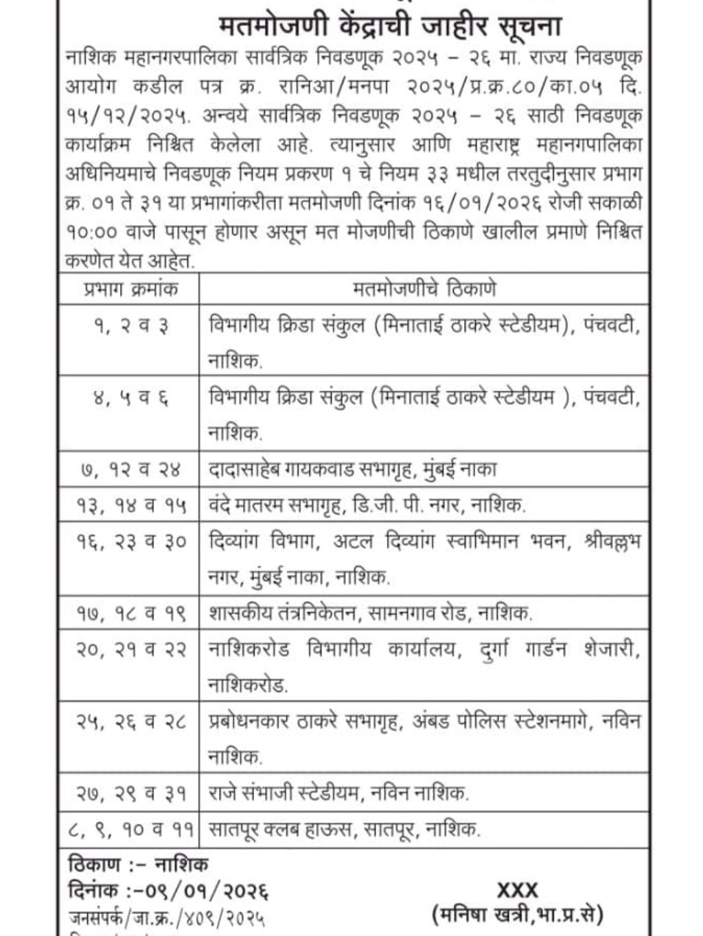 नाशिक, दि. १५ जानेवारी २०२६ : Nashik municipal corporation results नाशिक महानगरपालिकेच्या सार्वत्रिक निवडणुकीची मतमोजणी शुक्रवार, दिनांक १६ जानेवारी २०२६ रोजी सकाळी १० वाजता सुरू होणार असून, शहरातील ९ ठिकाणी मतमोजणी केंद्रे स्थापन करण्यात आली आहेत. लोकशाहीच्या या निर्णायक टप्प्यासाठी प्रशासनाने संपूर्ण तयारी पूर्ण केली असून, कायदा व सुव्यवस्था राखण्यासाठी तसेच वाहतूक कोंडी टाळण्यासाठी विशेष नियोजन करण्यात आले आहे.