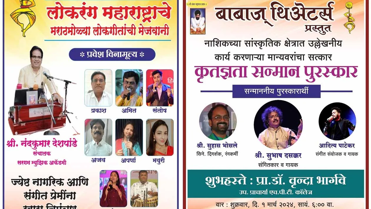 नाशिक ,दि, १ मार्च २०२४ –नाशिकच्या सांस्कृतिक क्षेत्रात मह्त्वाचे योगदान देणाऱ्या बाबाज थिएटर्स तर्फे आज प्रशांत जुन्नरे यांच्या संकल्पनेतून “लोकरंग महाराष्ट्राचे ” हा नंदकुमार देशपांडे, सरगम अकादमी प्रस्तुत लोकसंगीतावर आधारित नव्या.जुन्या गाण्यांची सांगितिक मेजवानी नाशिककरांना अनुभवता येणार आहे. त्याच प्रमाणे याच कार्यक्रमात सांस्कृतिक क्षेत्रात विशेष उल्लेखनीय कार्य करून नाशिक चे नाव जगाच्या नकाशावर नेणाऱ्या नाशिकचे ज्येष्ठ संगीतकार श्री. सुभाष दसक्कर,, सुप्रसिद्ध सिने दिग्दर्शक, रंगकर्मी श्री. सुहास भोसले आणि निवेदित तरुण कलाकार संगीत संयोजक, गायक आदित्य पाटेकर यांना नाशिकच्या एच.पी.टी.कॉलेजच्या माजी प्राचार्या प्रा.डॉ.वृंदा भार्गवे यांच्या शुभ हस्ते “कृतज्ञता पुरस्कार “प्रदान करून त्यांच्या कार्याचा गौरव करण्यात येणार आहे.आज सायंकाळी ६ वाजता कुर्तकोटी सभागृह,शंकराचार्य न्यास,गंगापूर रोड येथे या कार्यक्रमाचे आयोजन करण्यात आले आहे अशी माहिती बाबाज थिएटर्स चे प्रमुख प्रशांत जुन्नरे यांनी दिली.