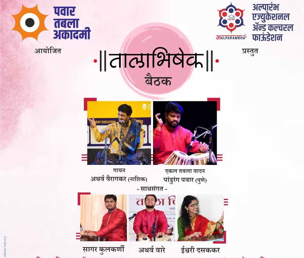 नाशिक,दि. २७ सप्टेंबर २०२३ – पवार तबला अकादमी आणि अल्पारंभ एज्युकेशनल अँड कल्चरल फाऊंडेशन आयोजित कुसुमाग्रज प्रतिष्ठानच्या सहकार्याने नाशिककरांसाठी ‘तालाभिषेक बैठक ’ या छोटेखानी संगीत मैफिलीचे आयोजन दर दोन महिन्यांतून एकदा केले जाते. याद्वारे नवोदित तसेच प्रथितयश गायक व वादकांची कला जवळून अनुभवण्याची संधी संगीत रसिकांना मिळणार आहे.