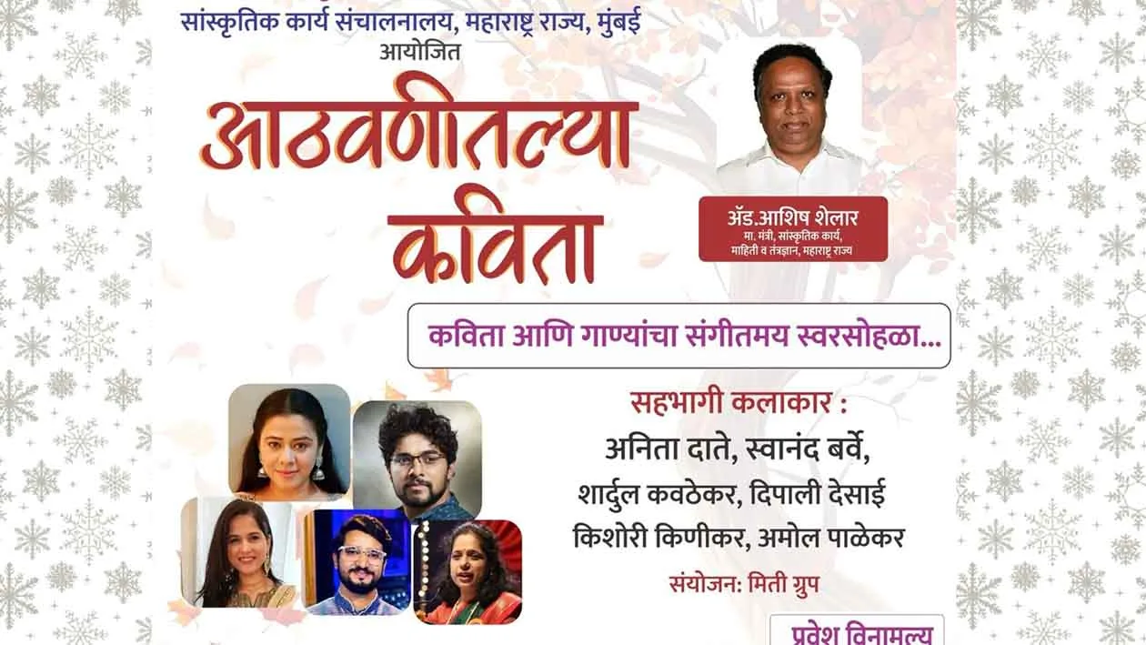 नाशिक,दि,१२ मार्च २०२५ – महाराष्ट्र शासनाच्या सांस्कृतिक कार्य विभाग,सांस्कृतिक कार्य संचालनालय, महाराष्ट्र राज्य, मुंबई यांच्या वतीने एक अनोखा आणि सुरेल कार्यक्रम नाशिकमध्ये आयोजित केला जात आहे. आठवणीतल्या कविता…!! हा संगीत व कवितांचा अनोखा मिलाफ असलेला कार्यक्रम शुक्रवार, १४ मार्च २०२५ रोजी सायंकाळी ६ वाजता विशाखा सभागृह, कुसुमाग्रज प्रतिष्ठान, गंगापूर रोड, नाशिक येथे रंगणार आहे. या खास सांस्कृतिक सोहळ्याचे संयोजन मिती ग्रुप, मुंबई यांच्यातर्फे करण्यात आले आहे.