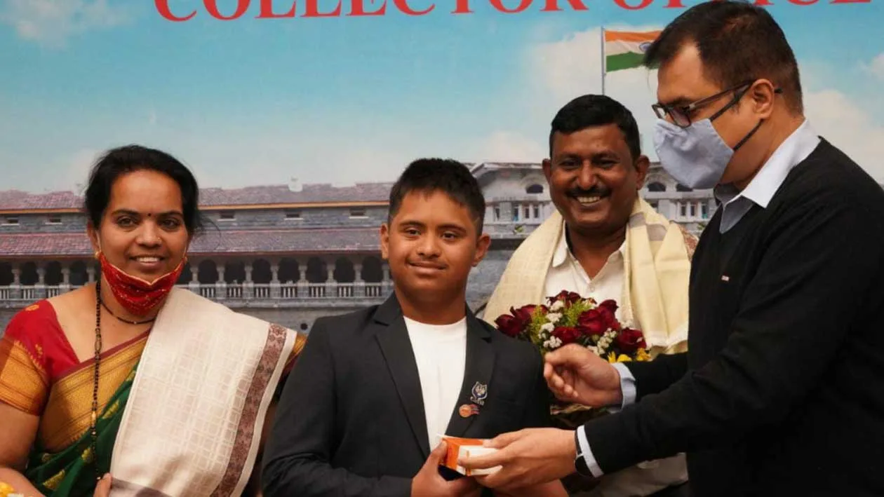 दूरदृष्यप्रणालीद्वारे झालेल्या पुरस्कार वितरण कार्यक्रमानंतर जिल्हाधिकारी सूरज मांढरे यांनी स्वयंम पाटील व त्याचे आई वडील यांचा सत्कार करून अभिनंदन केले.