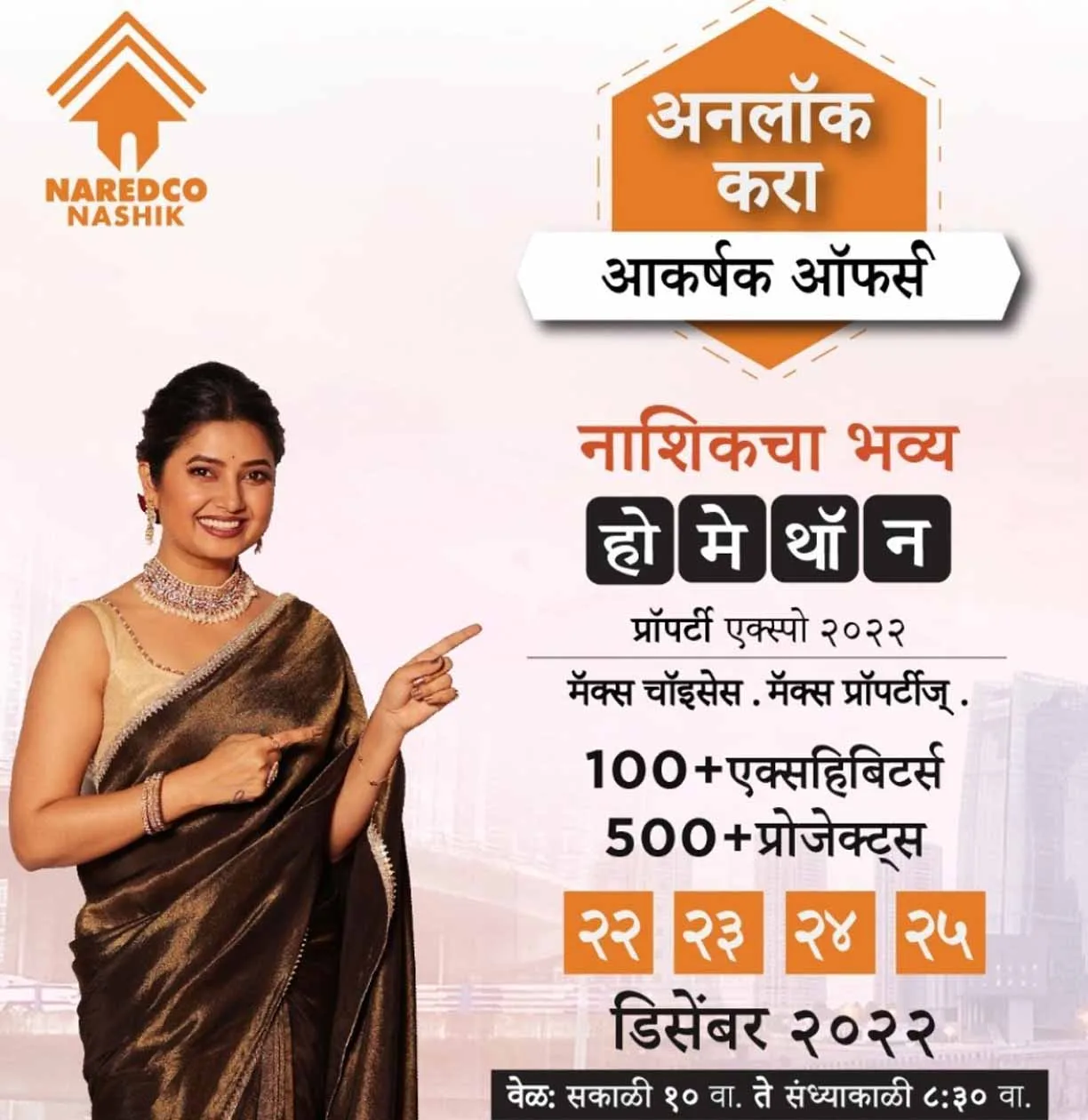 अभिनेत्री प्राजक्ता माळी हि नरेडकोच्या होमथॉन एक्स्पो २०२२ या प्रदर्शनासाठी ब्रँड ॲम्बेसिडर आहे.त्या देखील या प्रदर्शनाला भेट देणार आहेत. प्रदर्शनाचे उद्घाटन नरेडकोचे व्हाईस प्रेसिडेंट आणि बांधकाम क्षेत्रातील अर्ध्वयू डॉक्टर निरंजन हिरानंदानी आणि नरेडको नॅशनल प्रेसिडेंट श्री. राजन बांदलकर यांच्या हस्ते होणार आहे.दीपक बिल्डर्स आणि डेव्हलपर नरेडको नाशिक होमथॉन एक्स्पो २०२२ चे मुख्य स्पॉन्सरर आहेत. दीपक बिल्डर्सचे श्री. दीपक चंदे यांनी “मॅक्स चॉईसेस – मॅक्स प्रॉपर्टीज”असलेल्या प्रदर्शनाला नागरिकांनी भेट द्यावी असं आवाहन केलं आहे.आपल्या स्वप्नातीलघर घेण्यासाठी ही एक सुवर्णसंधीच असून नागरिकांसाठी होमेथॉन २०२२ प्रॉपर्टी एक्स्पो हे प्रदर्शन एक पर्वणीच असणार एवढे मात्र नक्की